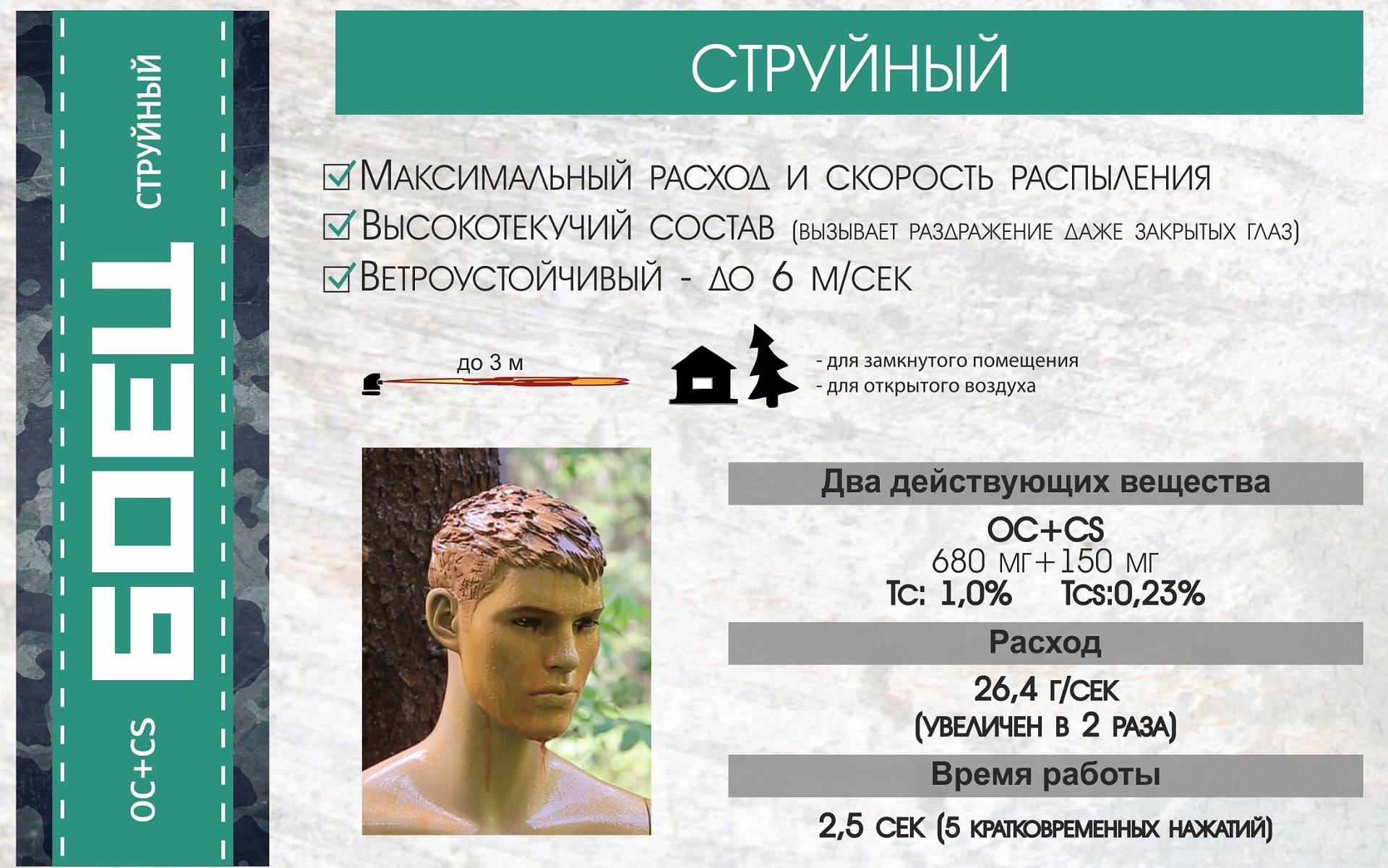 Слезоточивые вещества (ирританты): CS 150 мг (концентрация 0,23 %), C (суммарное содержание капсаициноидов) 646 мг (концентрация 1,0 %)