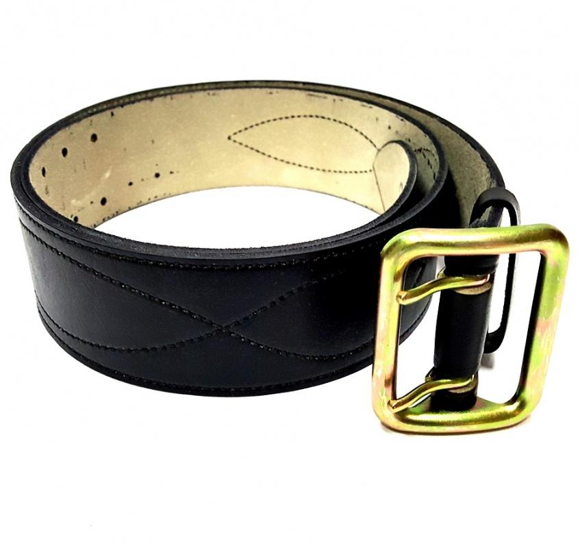 Ремень поясной кожаный со штампованной металлический двухшпеньковой пряжкой. Ремень без кожаной подкладки, ремень прошит ниткой.