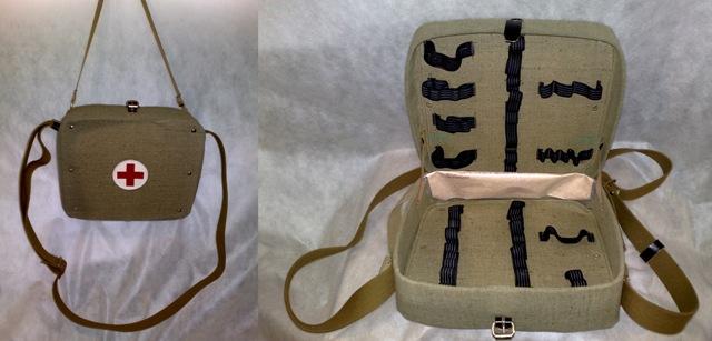Сумка медицинская войсковая СССР новая, брезентовая, имеет жёсткую основу (выполнена в виде чемоданчика). Оснащена регулируемым по длине ремешком, для ношения в руке либо на плече, имеет множество держателей различных размеров под самый разнообразный инвентарь.